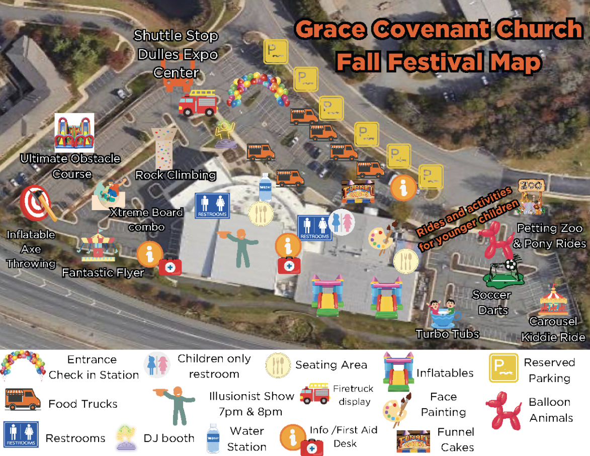 Join us for our annual Grace Covenant Church Fall Festival on Wednesday October 29. Fall Festival has something for all ages & the whole family is filled with family-friendly entertainment and attractions including food trucks, fire pits, skateboarding exhibition, carnival rides, inflatables, and more.
